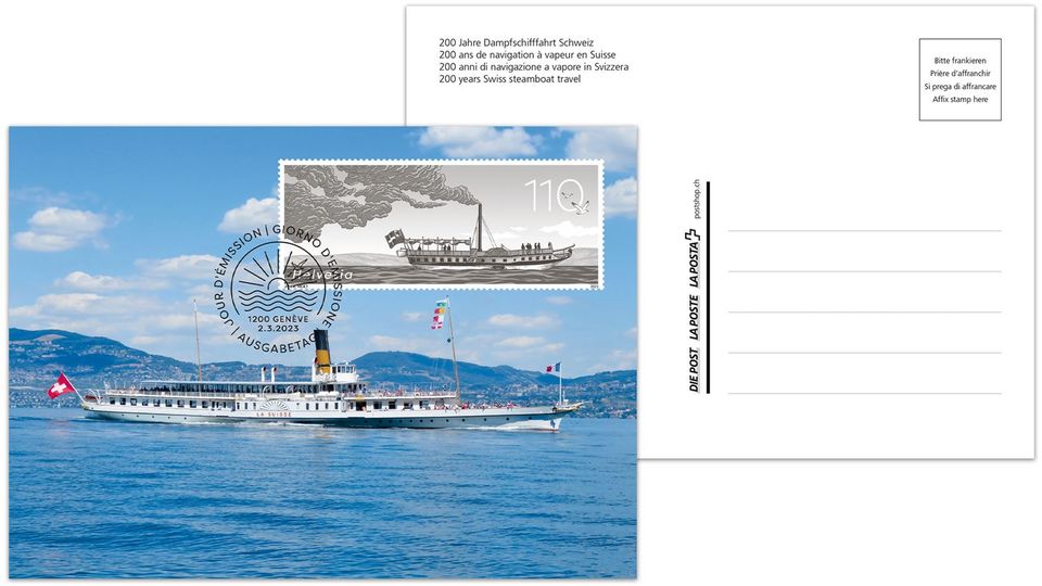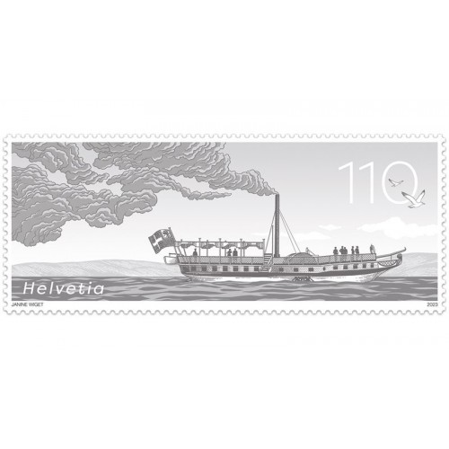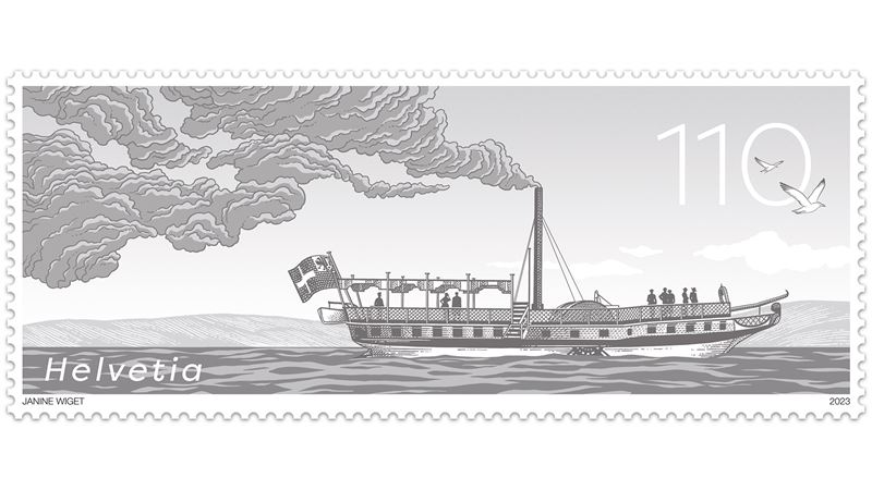 On 18 June 1823, the Guillaume Tell, Switzerland’s first steamboat, set off on its maiden voyage across Lake Geneva, heralding the start of a new machine age. There are hardly any images of the ship, but 200 years later, we do now have a stamp in a special format. Measuring 80 × 33 millimetres, the special stamp shows a historical milestone for which there are no photos and very few drawings: the Guillaume Tell, Switzerland’s first steamboat. With a view to creating a retrospective for the anniversary, a dark special colour was chosen for the illustration. Almost as if it was designed all those years ago. Back then, the Guillaume Tell plied its trade between Geneva and Lausanne. While it was mainly used to transport goods on weekdays, passengers were also welcomed on board at weekends. The success of the paddle steamer gave impetus to local industrialization. Despite initial scepticism, people soon realized that if something works in the water, it can also be used on land. And so the use of steam engine technology soon made its way into industry and rail transport, accelerating Switzerland’s development